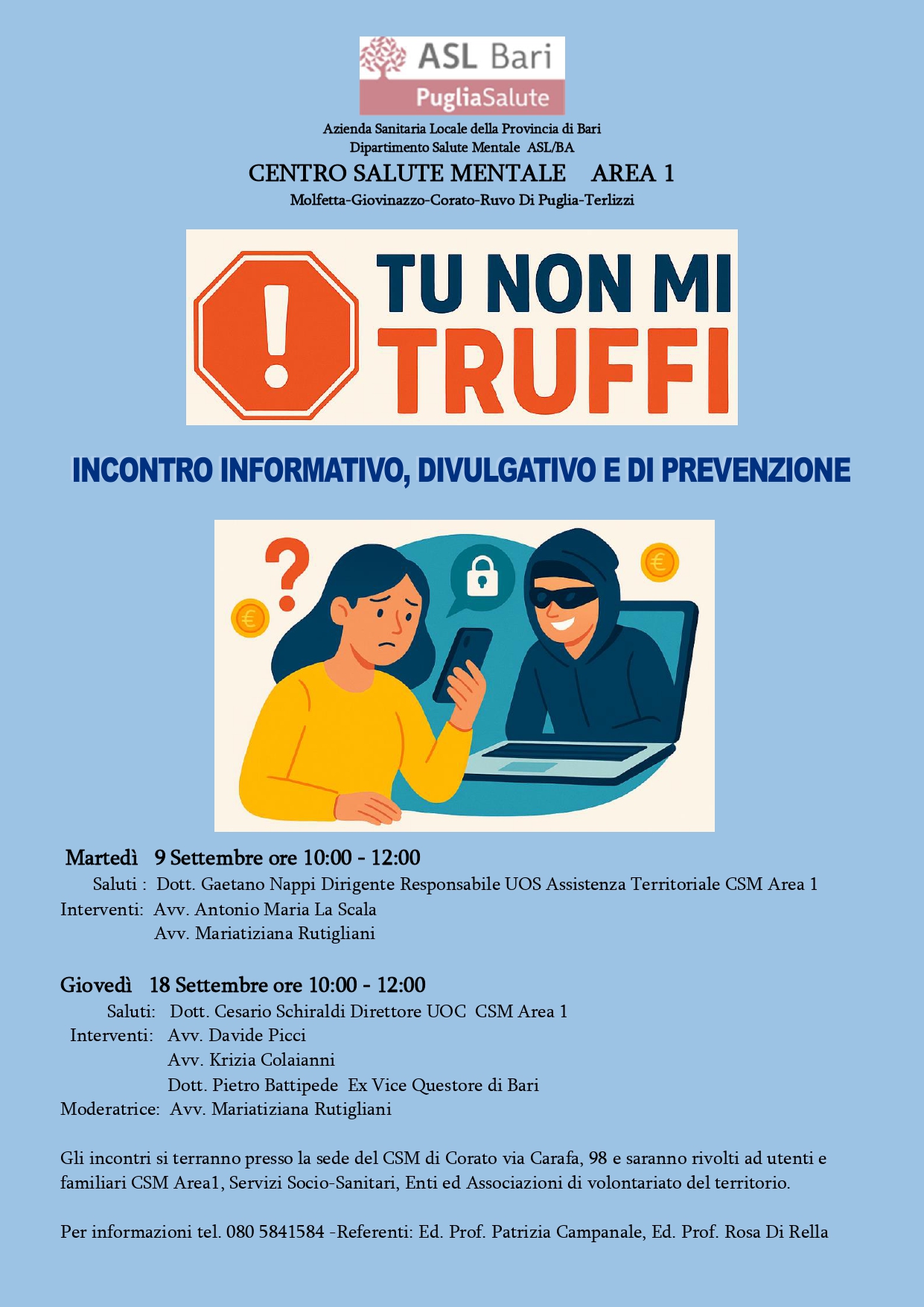 Il progetto “Tu non mi truffi”, proposto nell’ambito delle attività riabilitative e socializzanti e di lotta allo stigma che si svolgono sul territorio del CSM Area 1, nasce con l’obiettivo di sensibilizzare gli utenti e i loro familiari sull’importanza di informarsi e agire con prudenza, fornire strumenti pratici e aggiornati per riconoscere i tentativi di truffa, promuovere comportamenti protettivi e strategie dì prevenzione quotidiana, stimolando la partecipazione attiva dei cittadini come comunità consapevole e più protetta.