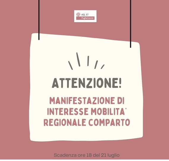 In esecuzione dell’Accordo Regione Puglia - OO.SS. Comparto Sanità, a partire dalla data odierna ed entro, e non oltre, le ore 18 del 21 luglio, è possibile partecipare alla Manifestazione di interesse alla Mobilità Intra-Regionale del Personale del Comparto Sanità, con rapporto di lavoro a tempo indeterminato presso una delle seguenti Aziende: Asl Ba, Asl Bt, Asl Fg, Asl Le, Asl Br, Asl Ta, AOU Policlinico Bari, AOU RR. Foggia, IRCCS Tumori “Giovanni Paolo” Bari e IRCCS “S. De Bellis” Castellana Grotte.