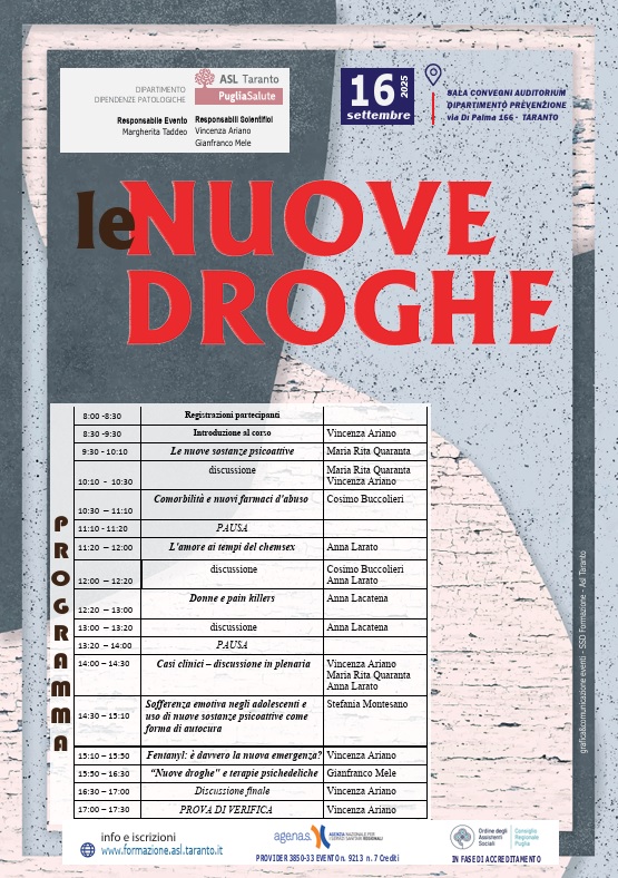 Il Dipartimento Dipendenze Patologiche e la Struttura della Formazione Aziendale e Università hanno organizzato l’evento formativo “Le nuove droghe” il 16 settembre 2025 presso Sala Convegni del Dipartimento di Prevenzione, via di Palma 166 Taranto.