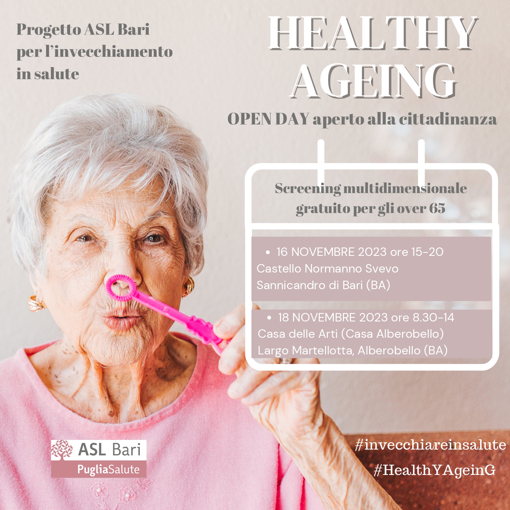 Bari, 16 novembre 2023 – Migliorare le condizioni fisiche, piscologiche e relazionali delle persone anziane in una ottica di prevenzione e integrazione sociale. E’ l’obiettivo del progetto “Healthy Ageing – Invecchiare in salute” promosso dal Dipartimento di prevenzione della ASL di Bari e rivolto agli over 65 residenti nel territorio provinciale che attualmente costituiscono il 20% della popolazione della città metropolitana di Bari.