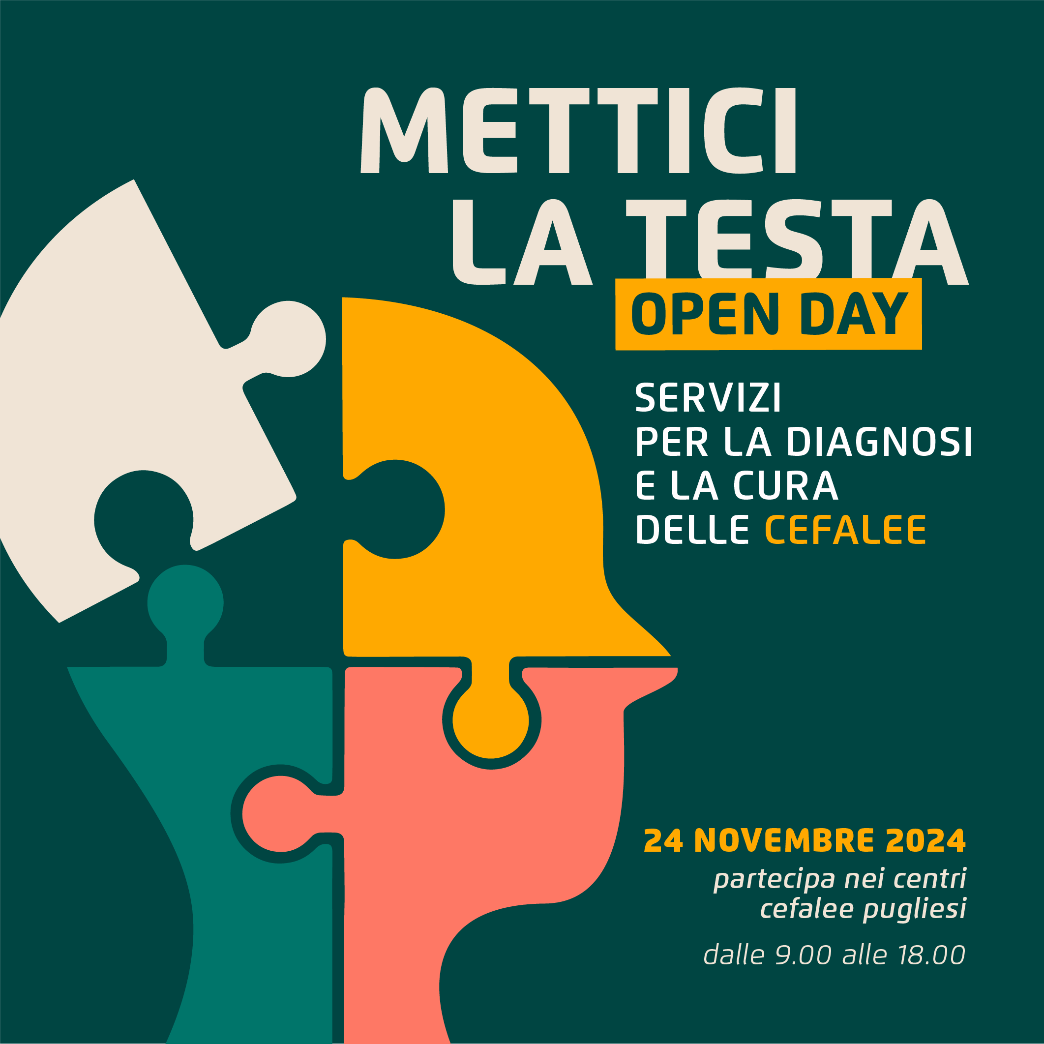 L’Open day regionale è previsto domenica 24 novembre. Hanno aderito 19 centri in tutta la Puglia e dalle 9.00 alle 12.00 sarà possibile effettuare un consulto gratuito indirizzato a chi soffre di mal di testa ricorrenti, intensi e difficili da trattare.